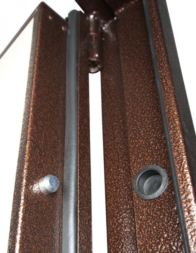 - Наружные петли не скрыты и не имеют защиты. Благодаря этому злоумышленник может их срезать. Однако даже в такой ситуации дверь невозможно снять благодаря запорам и защитным ригелям.