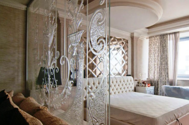 - украшение фацетными элементами (когда на стекло наклеивается узор из кусочков стёкол со скошенным краем) и гравировка — самые благородные способы декора, которые можно вписать в любой интерьер. Такая перегородка напоминает огромный переливающийся кристалл, но при этом не выделяется кричащей красотой.