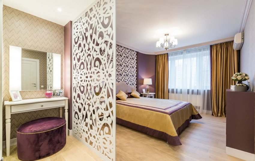 В спальной комнате иногда требуется отделить гардеробную или зону для мейкапа. Конечно, молодая пара обычно не стесняется друг друга, поэтому уединённая зона для переодевания ей не нужна, но появление детей всё меняет. Годовалые малыши и двухлетки уже очень активно интересуются окружающим, так что спрятаться от них за ширмой — отнюдь не лишнее.