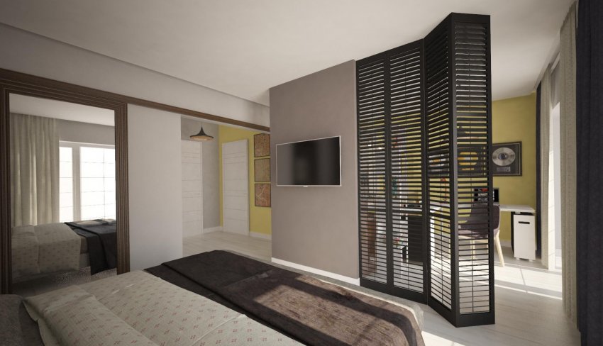 Чаще всего перегородки встречаются в однокомнатных квартирах с отдельной кухней и студиях (когда пространство открыто полностью), что вызвано естественной потребностью скрыть некоторые зоны от глаз гостей. Спрятать за такой конструкцией двуспальную кровать — вполне рациональное и реализуемое решение, особенно для тех, кому неудобно спать на диване или сложно трансформировать его. В таком случае низ перегородки делают непроницаемым, а верх — ажурным или светопрозрачным.
