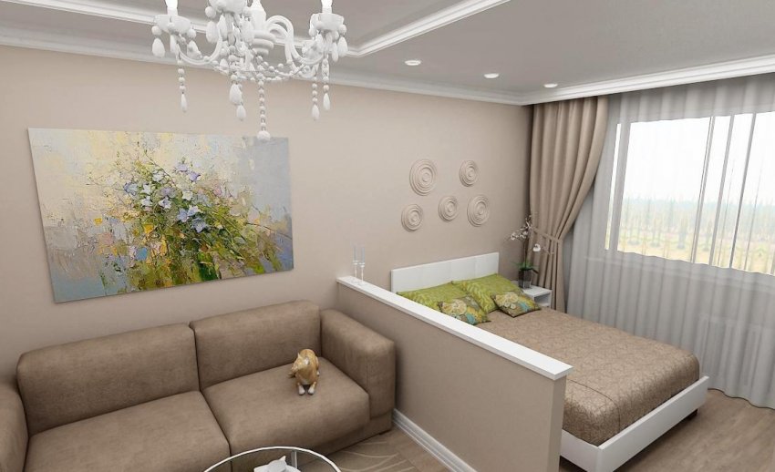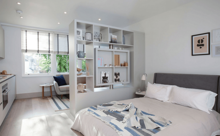 Даже низкая перегородка может обеспечить визуальное зонирование небольшого помещения