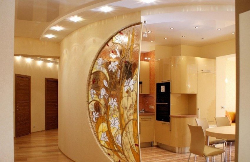 Стеклянная вставка с витражом эффектно добавила в интерьер характерные черты модерна