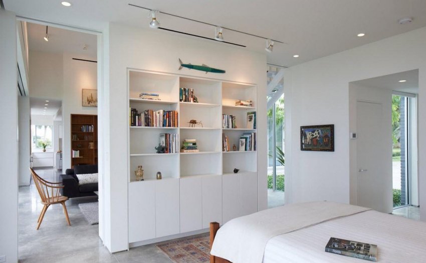 Сквозная мебельная перегородка удачно задаёт логику планировки помещения