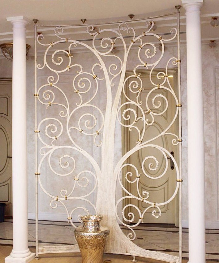 Металл в перегородках используют в двух вариантах — для каркаса стеклянных изделий и в виде кованных элементов. Первые подходят для современных стилей, вторые отлично сочетаются с классикой, романтическим, дворцовым, барокко, гламуром. Но идеальное пространство для кованной перегородки — комната в стиле модерн.