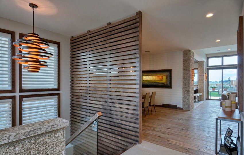 Среди достоинств деревянных конструкций также умеренный вес и возможность монтажа уже после поклейки обоев. А это значит, что для добавления такой перегородки необязательно затевать масштабный ремонт. Кстати, на основе дерева можно делать как стационарные, так и сдвижные модели, а также передвижные ширмы и стеллажи. Но чаще всего из деревянных планок формируют жалюзи из вертикальных либо горизонтальных ламелей. Такой вариант позволяет одновременно использовать прочность дерева и обеспечить светопрозрачность конструкции.