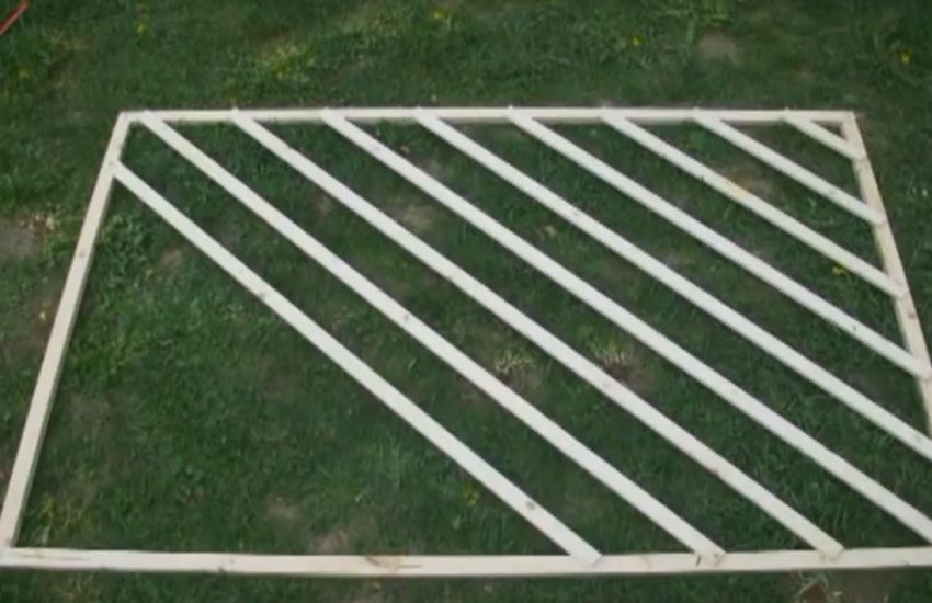 - Подрежьте пиломатериалы до нужных размеров и разложите решётку на полу так, как планируете её смонтировать. Если недочётов нет, можно скрепить конструкцию из горизонтальных и вертикальных планок саморезами или декоративными гвоздиками.