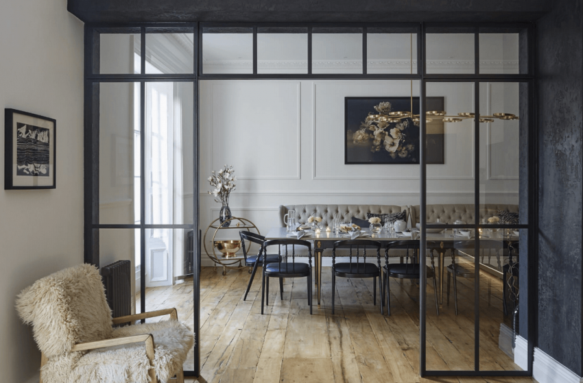 Стеклянная перегородка с металлическим каркасом отлично вписывается в комнату с классическими нотками
