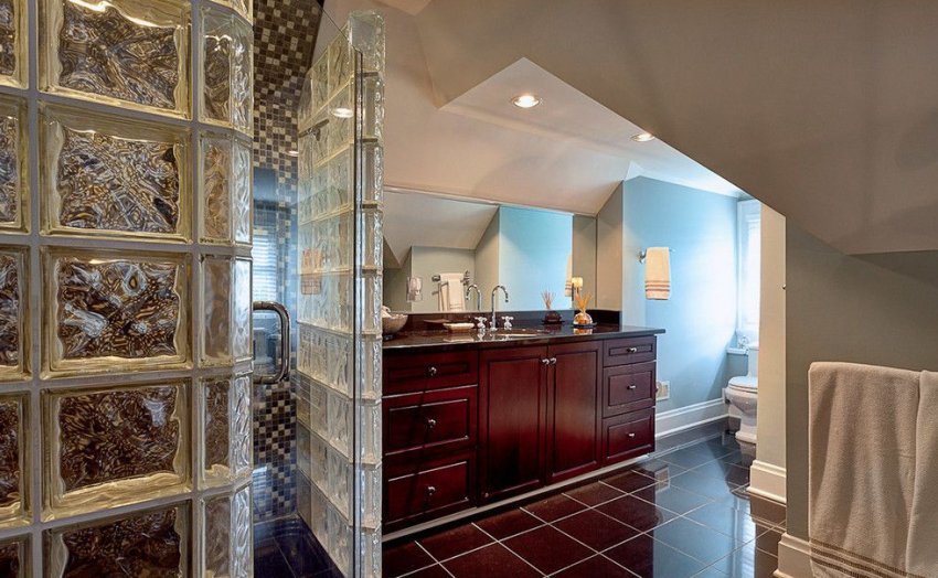 Душевая зона из стеклоблоков выглядит роскошно и необычно