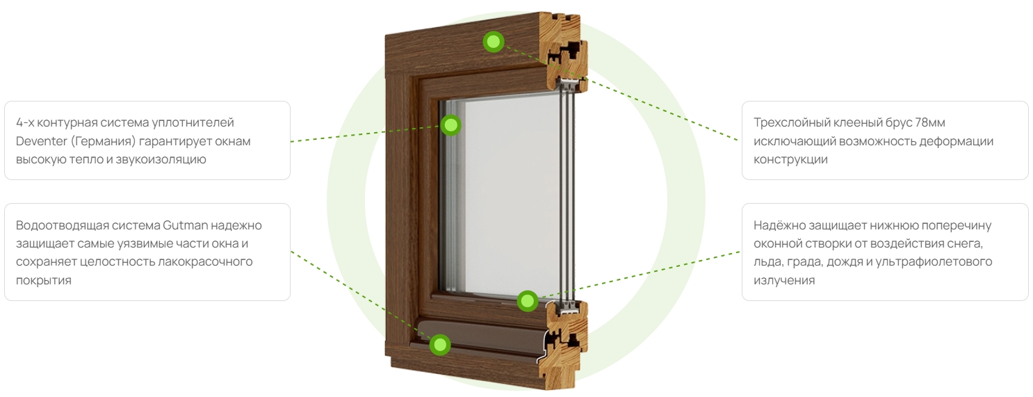 Рамы изготавливаются из нескольких слоев древесины, часто применяя клееный брус, что значительно повышает тепло- и звукоизоляционные свойства окон. Такая многослойная структура усиливает прочность изделий. Для обеспечения герметичности в конструкции устанавливают специальные уплотнители.